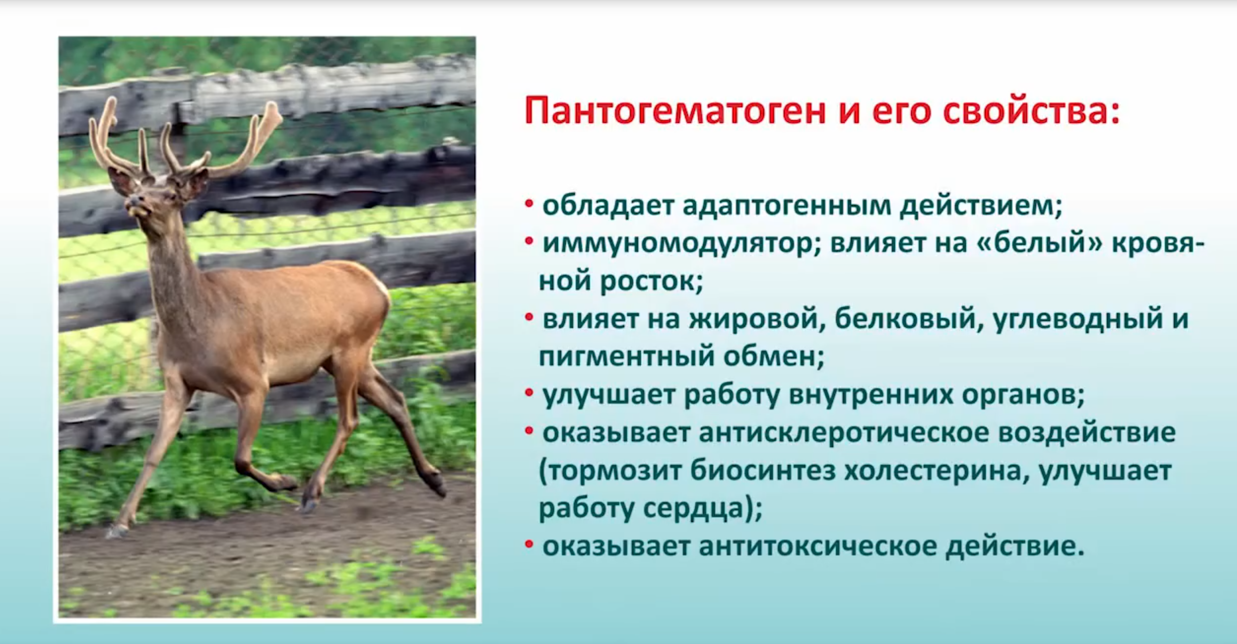 Пантогематоген является источником целого ряда веществ - это микроэлементы, незаменимые аминокислоты (аспарагиновая, глутаминовая кислоты, лизин, пролин, глицин и др.), пептиды, фосфолипиды, широкий спектр насыщенных и полиненасыщенных жирных кислот. Пантогематоген способствует выработке цитохрома Р-450, участвующего в микросомальном окислении - процессе обезвреживания многих чужеродных веществ и токсинов, а также более быстрому восстановлению и нормализации функционального состояния органов и систем.