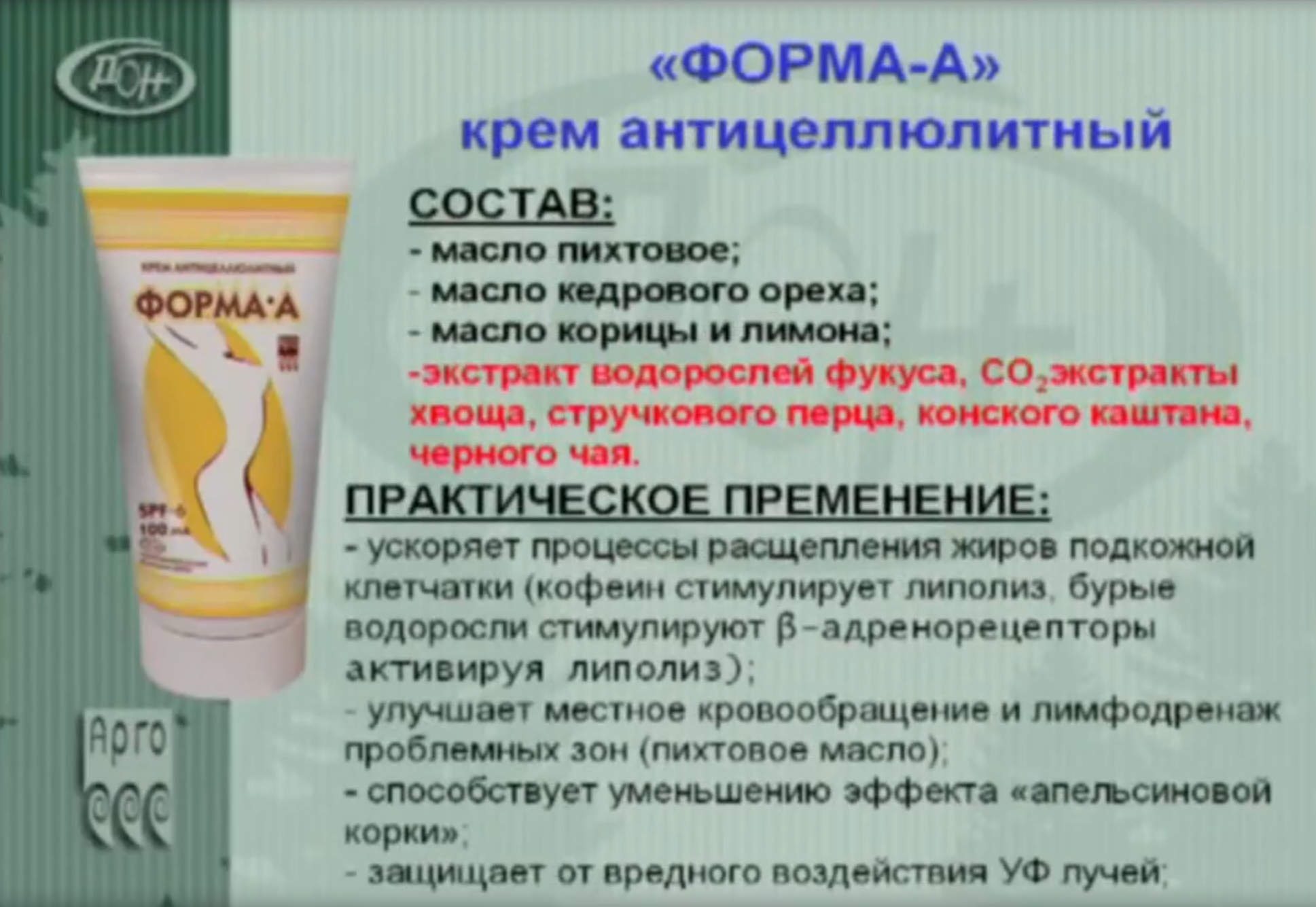 Фукус пузырчатый (Fucus vesiculosis) и Ламинария сахарная (Laminaria saccharina), Ламинария японская (Laminaria japonica). Экстракты водорослей стимулируют ?-адренорецепторы жировых клеток и усиливают липолиз, улучшают водно-солевой обмен в подкожной жировой клетчатке и отток тканевой жидкости, выводят токсины и продукты жизнедеятельности клеток, повышают тонус кожи и сосудов.