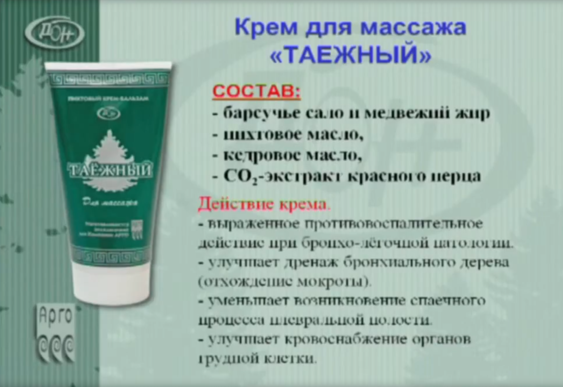 В креме-бальзаме Таёжном используются лечебные свойства барсучьего и медвежьего жира и СО2-экстрактов лекарственных растений.